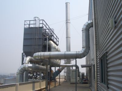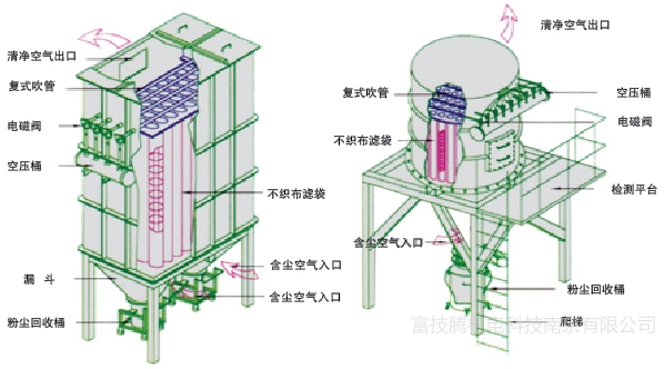 正常工作時,在系統風機的作用下,含塵氣體吸入進氣總管,通過各進氣支管均勻地分配到各進氣室,然后涌入濾袋,大量粉塵被截留在濾袋表面上,而氣流則透過濾袋達到凈化。凈化后的氣流通過袋室沿管路通過風機進入煙囪而排入大氣。