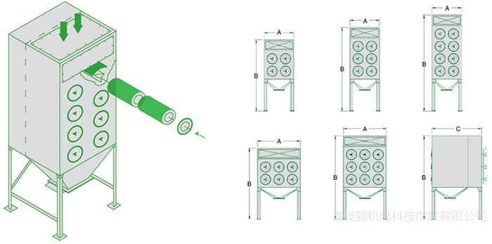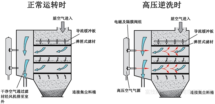 正常運行時,啟動風機,含塵空氣由頂部或前部入口進入集塵機,并通過濾筒過濾,粉塵則被捕集在濾筒外表面,清潔空氣則經過濾筒中心進入清潔空氣室,再經出口排出。